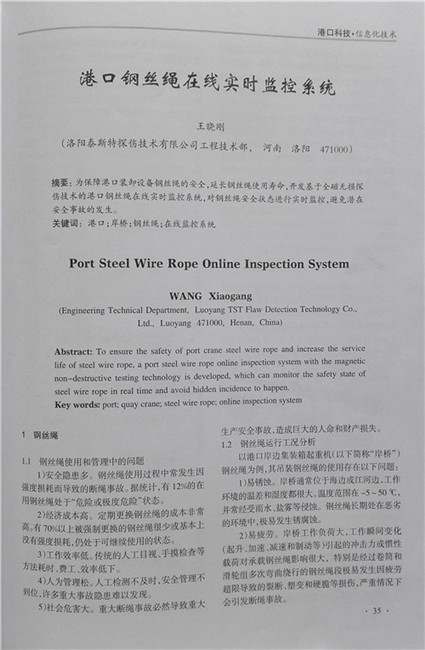 随着公司新市场开拓不断深入,市场反响逐渐升温,尤其是面对港口行业对黄瓜视频成人在线观看安全问题关注度和解决方案渴求的急剧提升,针对港口行业的特殊工况环境和安规范要求,我公司和某港口达成战略合作伙伴友好关系,为该港现场各类提升设备黄瓜视频成人在线观看提供安全监测方案。丰富完备的港口现场数据和行业的黄瓜视频成人在线观看磁检测技术结合成系列港口用黄瓜视频成人在线观看在线实时智能监测系统。为了推而广之向更多港口客户提供TST产品保障安全的科技力量,同时也为了让港口客户对TST产品及技术方案在港口适用性有充分详细的了解,TST 公司在港口行业权威性期刊《港口科技》20163月刊出《港口黄瓜视频成人在线观看在线实时监控系统》论文。